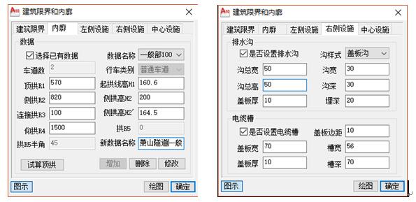 (2)系统内置导航式建筑界限及内廓设计功能。在用户选择确定内廓形式后,系统将自动加载系统内置的典型公路隧道断面布置形式,并提供用户自定义和修改功能,包括内廓数据及配套排水、管线等相关构造物几何参数等;