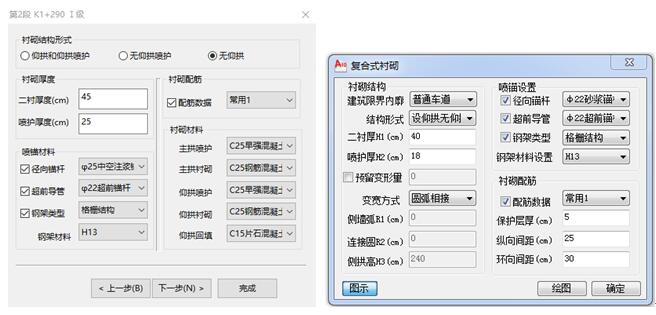 (4)系统可根据隧道衬砌分段情况快速完成各段衬砌结构设计,用户仅需录入部分关键参数和简单的勾选即可完成超前支护、支撑钢架、衬砌结构、二衬配筋等各环节的几何设计和圬工、钢筋数量计算,用户也可以基于自动设计成果做进一步细化与调整;