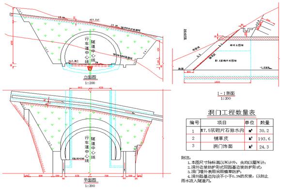 (7)系统根据隧道洞门设计数据,自动绘制洞门立面、平面、剖面设计图、明洞开挖图;自动分类统计输出洞门工程数量表等;
