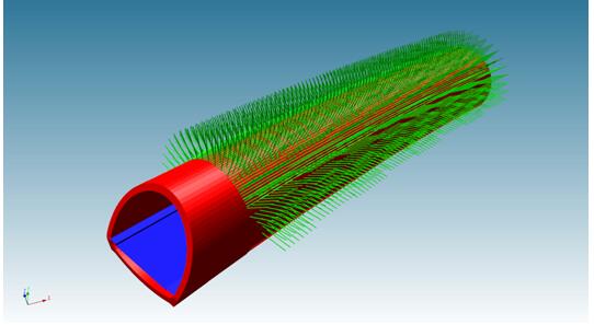 (5)系统根据衬砌分段与装配衬砌数据,自动生成隧道洞身的衬砌BIM三维实体模型,包括内廓、外廓、锚杆、二衬钢筋等,进而可基于BIM模型进行衬砌设计、钢筋布置等的“碰撞检查”、与设计合理性分析;