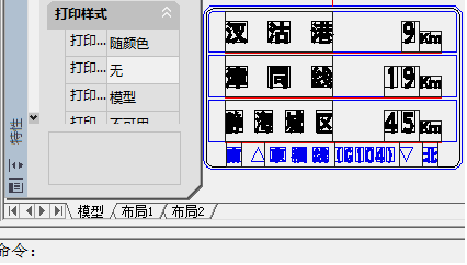 如图1所示标志版面,交叉口两侧的文字关于交叉口标志图形左右对称。首先我们可以将左侧文字(泗村店、廊坊)设置好,接着输入镜像命令(mirror),根据提示指定镜像线两点,系统会自动将左侧文字准确无误地对称显示在交叉口右侧,我们只需将文字内容改为对应地名即可,无需在利用其它辅助功能来调整右侧文字的位置,如图2.