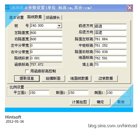 2.打开基本参数设置窗口,切换到路线数据一栏中,点击“提取信息”,系统自动从纬地路线数据中提取当前桩号的路基宽度、路面标高、地面线数据、边坡数据等信息,用户只需要根据当前项目的实际情况输入涵底标高或填土高即可(如果输入涵底标高,系统会自动反算出填土高;反之,输入填土高,系统自动反算出涵底标高)。