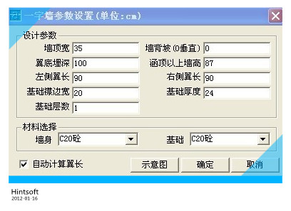 3.点击“计算绘图”,绘制出涵洞布置图,先初步查看一下出图效果。然后再次打开基本参数设置窗口,对涵底纵坡、左右进出口形式(比如左洞口设为边沟跌水井,右洞口设为出口急流槽)、左右一字墙(根据实际情况来设定)参数进行设置。由于此种断面形式左侧为挖方断面,我们此时就需要在左侧一字墙参数中进行“涵顶以上墙高”设置