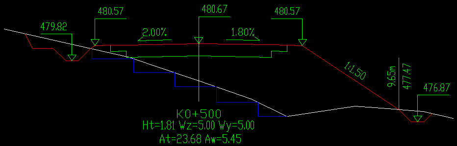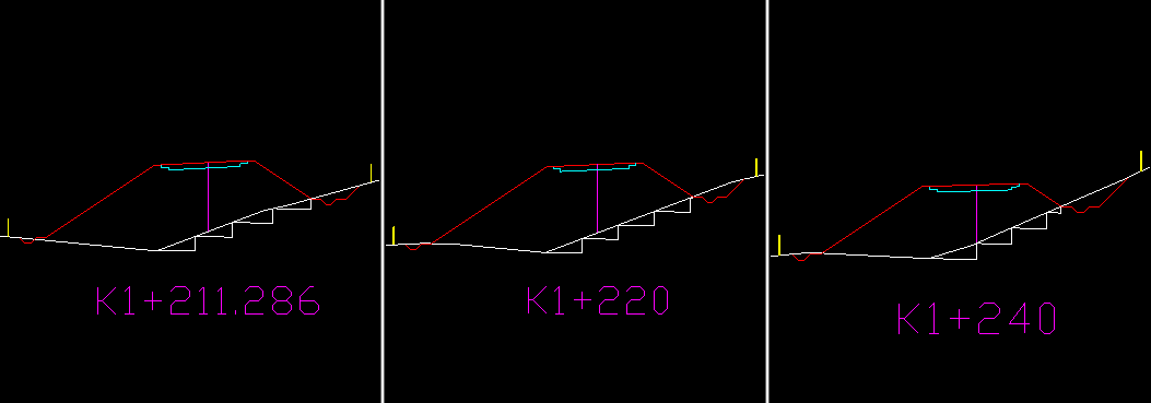 标准横断面挖台阶处理设置完成之后,即点击“横断面戴帽”功能挖台阶的批量处理及工程量统计(一)(或CAD命令行输入“_HDM_CAL”),则系统弹出来戴帽的起止桩号范围,设置好戴帽桩号范围,点击确定,系统会自动搜索并一次性完成当前标准断面所控制的戴帽桩号范围内横断面的挖台阶处理,如图6所示。