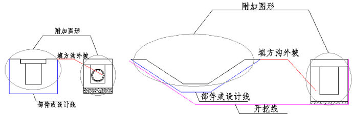 这里需要说明的是绘图单位为米,图中1个单位长度表示1米;定制部件模板时均以路基右侧边沟为准,添加至部件库之后系统自动镜像为左侧边沟部件模板。图中线条颜色仅为方便说明,可以一种颜色绘制。如上图蓝色线条为部件或设计线,需采用多段线(pline)从左上端点开始绘制,多段线的起点也就是边沟的插入点(近路面点)。红色线条为填方沟外坡,即沟外护坡设计线,需采用多段线接着部件设计线进行绘制。沟外填方边坡需按照设计的坡度准确绘制,当边沟外侧设计线位于填方时,系统即采用该填方沟外坡设计线进行沟外护坡及平台的绘制。圆圈内包含的黑色图形实体均为该边沟的附加图形,附加图形采用直线或圆弧绘制,可以用来绘制盖板、垫层等表示边沟构造的所有线形,从而可在横断面图中实现边沟的细部构造断面图的绘制,附加图形位置可自定义,如上图中附加图形可绘制于边沟外侧。紫色线条为开挖线,需采用多段线进行绘制,开挖线位置及形状可自定义。