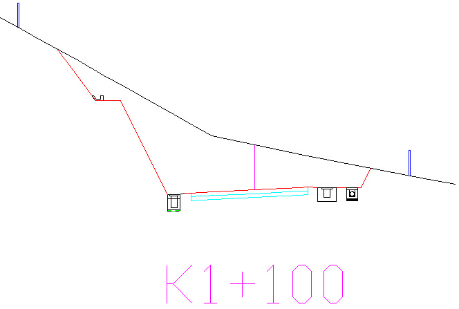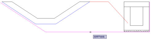接着CAD命令行提示选择填方沟外坡,选择红色填方沟外坡,如下图4;回车后系统提示选择开挖线,如果有开挖线则选择开挖线,如下图5,选择紫色开挖线;如果没有设置开挖线可按Esc键跳过此步骤,系统提示选择附加图形,选中附加图形后回车系统提示精确选择沟底位置,如图6,选择沟底位置后,该边沟图形即可保存为边沟部件模板。