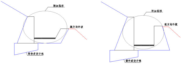 在路基设计中为了处理好开挖后地质较差的路基断面,路堤式路堑这种处理方式尤为常见。但是挖方一般是在路基边缘就接边沟,如何才能设置这种路堤式路堑的形式而后再接边沟呢?解决方法依然是采用横断面设计模块中的边沟部件模板定制方法,具体添加为模板的步骤如上述1所述,此处不再赘述。下图9所示为两个路堤式路堑的边沟图形: