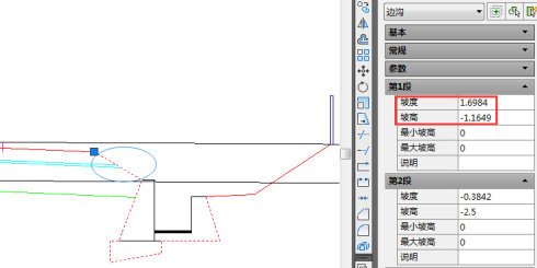 这种路堤式路堑的边沟图形存为边沟部件模板后,即可应用到横断面中,横断面上添加此类边沟后,选中该边沟部件设计线,在CAD特性中可修改第一段路堤边坡的坡度和坡高,这样即可解决不同断面该路堤边坡参数可能不同的情况,如下图10: