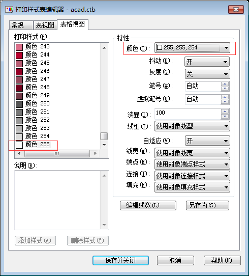 在打印样式设置中,对打印颜色进行设置。不能选择“对象颜色”,而要逐个去设置它的打印颜色,将254设置成黑色,255设置成接近于白色的颜色。目前出现问题最多应该是白色打印出来变成了灰色,这时我们可以在打印样式中将255颜色设置为其它颜色,如(255,255,254)接近于白色的颜色。