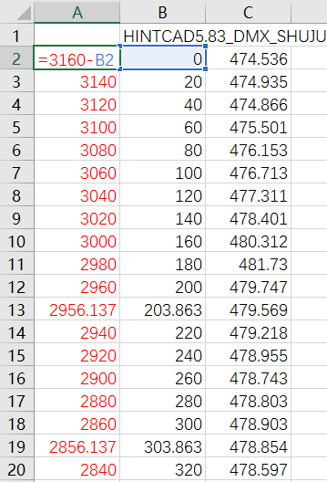 方法一:通常情况下,可利用excel表格功能进行相关数据的处理。比如纵断面地面线数据(或者纵断面拉坡设计数据.zdm),用excel表格打开对应数据文件,对桩号列进行倒排运算处理(终点桩号-当前桩号,参考图1 A列),删除原有桩号列(B列),保存即可完成。