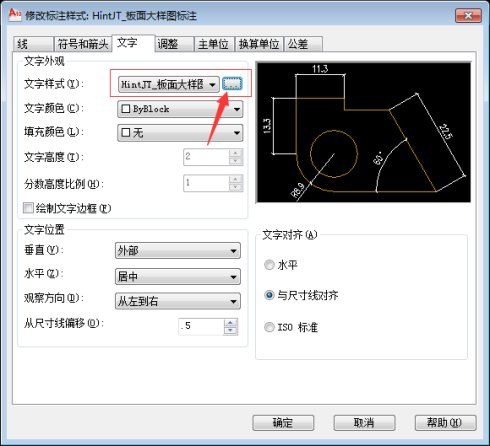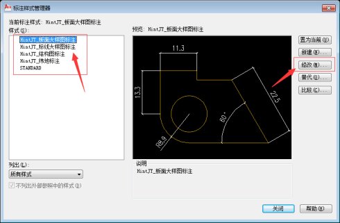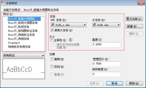 如下图,选择“板面大样图标注”,点击右侧的“修改”,在弹出的窗口中,点击“板面大样图”右侧的“小按钮”,即可对字高、字体样式进行调整和修改。如下图所示: