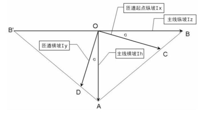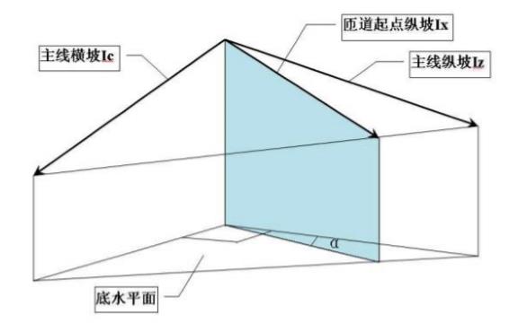 我们都知道,主线的临界纵坡、横坡及匝道的临界纵坡三者之间的关系如图1所示,以主线的临界纵坡矢量和横坡矢量构成一个平面,主线与匝道分离处(楔形端位置)匝道起点的平面线形偏离主线一个α角度,沿匝道方向的临界纵坡和匝道横坡必然也位于此同一平面。