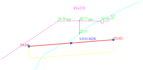 选择下图中的红线(涵顶线),通过夹点编辑,拖动修改涵洞填土高、涵底纵坡、左右进出口标高,即可对涵洞进行纵面布设调整。涵洞布置图即会根据这里的调整结果,自动重新绘图。如下图1所示: