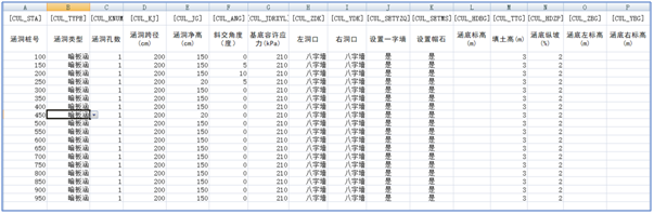 “涵洞批量导入模板.xlsx”的默认路径是:(C:\Program Files\HintCAD.co\纬地公铁涵洞CAD系统V4.02\通用图)。包含“涵洞桩号、涵洞类型、孔数、跨径、净高、斜交角度、基底容许应力、左洞口形式、右洞口形式、是否设置一字墙、是否设置帽石、涵底标高、填土高、涵底纵坡、涵底左标高、涵底右标高”等。如下图3所示: