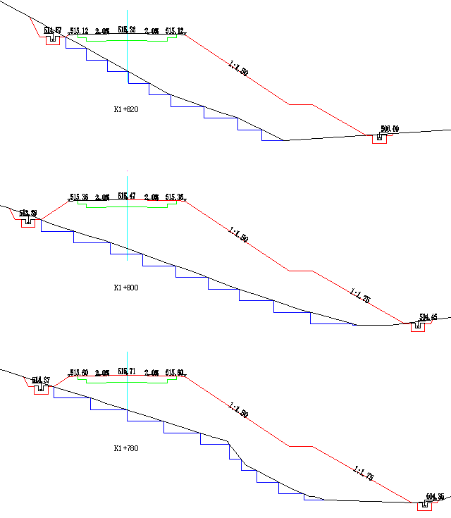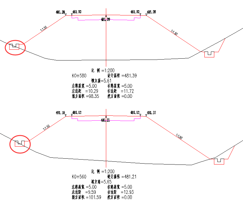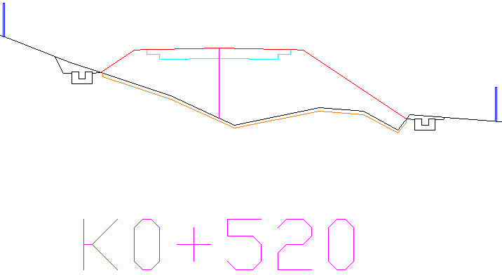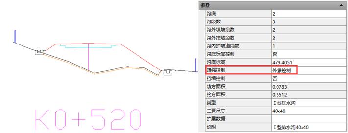 横断面戴帽完成后,往往会对局部不合理的地方进行细部的调整,如下图7,将K0+520左侧排水沟调整为外缘控制的方式,如下图8: