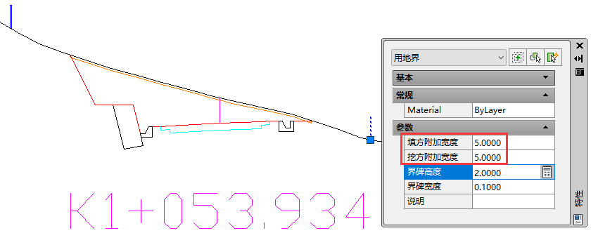 如下图11,原用地界为5米,现因征地受限,局部段落用地界范围需要调整到3米,在CAD特性中对该桩号位置的用地参数进行调整,如下图12。复制该桩号断面设计样式,只选择粘贴左右侧地面样式,批量粘贴至需调整用地界的桩号段落即可。操作同水沟样式批量粘贴,此处不再赘述。对于地面线的剪裁、清表、挖台阶等,地面样式批量粘贴功能均适用。