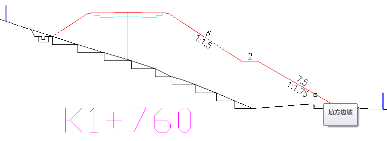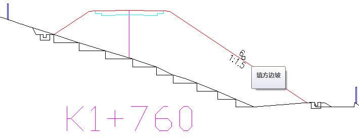 在横断面详细设计模块戴帽完成后,可对逐桩横断面进行相应的编辑和修改。如下图1,K1+760断面按照标准横断面样式戴帽后,发现右侧边坡坡高较大、坡度较陡,需要采取相应措施来增强其边坡稳定性,将右侧边坡调整为两级边坡,如下图2。