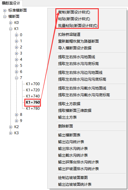 横断面详细设计模块提供单个横断面样式的粘贴功能,同时也支持横断面样式批量粘贴,以下主要以批量粘贴为主进行说明。