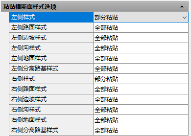 再将排水沟外缘控制的方式粘贴至所需桩号段落,只将左侧沟样式粘贴即可,粘贴选项如下图9,粘贴排水沟样式后的其他桩号段落成果如图10;对于水沟尺寸样式发生变化或采用沟底标高控制的方式,可不用重新进行横断面戴帽,使用复制、批量粘贴水沟样式即可。