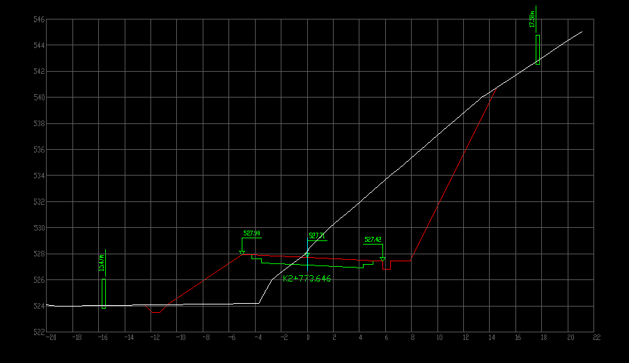 到这里,本文利用直线模板定义横断面网格线绘图模板的过程,就基本完成了。以下是应用网格线模板绘制的横断面设计图纸的样图,供大家参考: