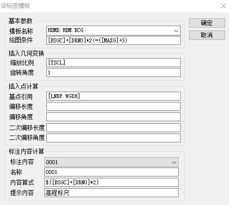执行新建标签(命令: CNEWLB),根据命令行提示,选择标签图元及文字,然后选择基点,系统即弹出标签设置界面。然后分别定义模板头、绘图条件、插入几何变换条件、插入基点计算及标注内容与计算各参数。下面就以竖向标尺标高标签为例进行详细讲解。