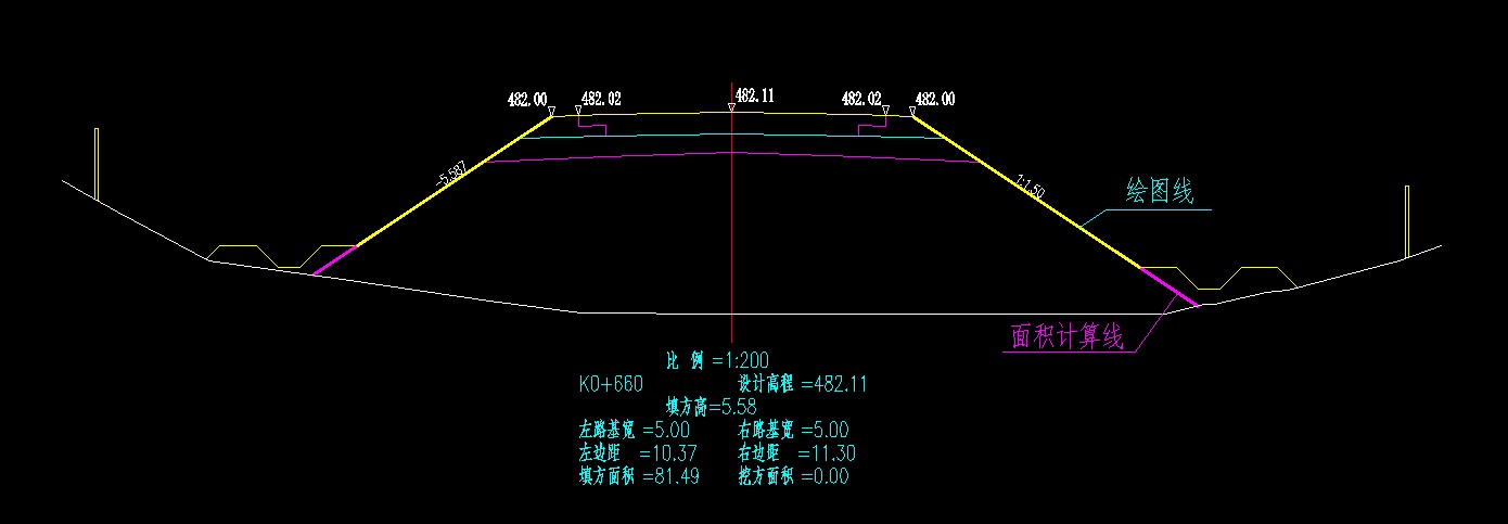 路基工程中,各部件往往因功能定位、造价、出图习惯等原因,会出现绘图线与面积计算线不同的情况,此时,需用户根据项目情况,定义多段线为绘图线或面积计算线。以填方边坡为例,如下图所示,当排水沟做过拉坡设计后,洋红线为面积计算多段线(即填方面积以洋红线为边界,其余土方将计入排水沟),而黄线为绘图线多段线。根据行业习惯,默认情况下并不输出面积计算线。