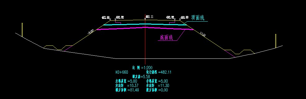 除上述多段线外,路基中还有部分部件,同时存在上下边界,如结构层中的垫层,路基断面中,因面层结构层外缘并未与垫层外缘严格对齐,往往需要同时绘制其上下边界线。此时需用到关键字[UPPL][DPPL] 以满足顶面线(青色)及底面线(洋红色)绘制。
