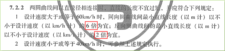 《公路路线设计规范》P31中7.2.2第1条规定:“设计速度大于或等于60km/h时,同向圆曲线间最小直线长度(以m计)以不小于设计速度(以km/h计)的6倍为宜;反向圆曲线间最小直线长度(以m计)以不小于设计速度(以km/h计)的2倍为宜。”