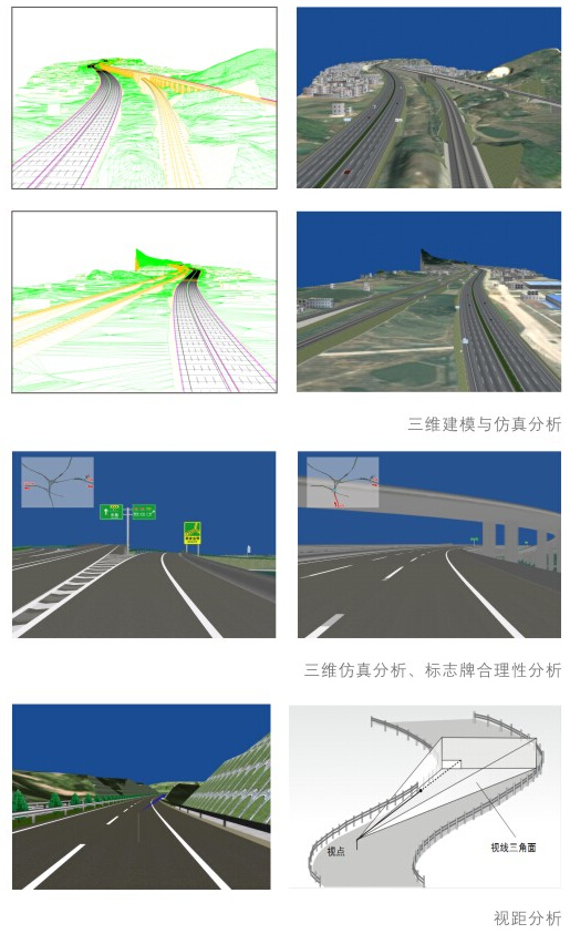 ●基于工程三维模型,虚拟仿真分析工程项目在设计阶段和运营阶段可能存在的各种问题(如视距检测、运行速度分析、标志牌合理性分析、互通立交出入口检查等等)。