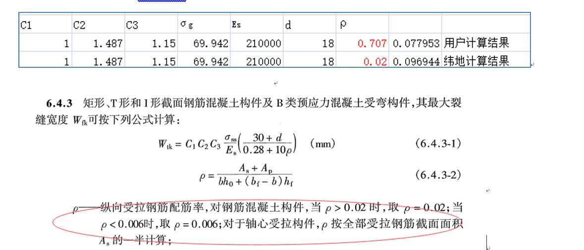 根据您反馈的文档资料(邮件内容附后),我们初步认为问题出在您(贵单位)手工核算时对配筋率参数的取值上。我们发现您(贵单位)核算时,直接使用“实际配筋率”(0.707)进行计算;而软件依据《公路钢筋混凝土及预应力混凝土桥涵设计规范》第6.4.3规定,裂缝宽度计算中的配筋率并非实际配筋率,应该按下述规定取值。针对您的具体项目,此处应取0.02,而并非“实际配筋率”。由此,导致您(贵单位)手工核算与软件计算结果不同的现象,而纬地涵洞软件的取值和计算结果应该是正确的!